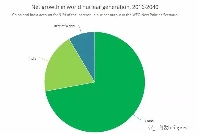 IEA世界能源展望(WEO New Policies Scenario)預計,到2040年核電投資將達1.1萬億美元,然而核能在全球發電中的份額下降到10%,增加的核電量不到IEA可持續發展假設(Sustainable Development Scenario)的一半。