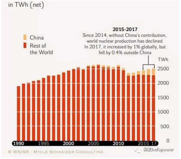 中國在2017年增加了三個新反應堆,目前運行反應堆總數達到41個,僅次于美國和法國。該國的核電量也達到了本年度的最高水平,世界核工業狀況報告顯示,其總產量增長了18%,或35太瓦時。