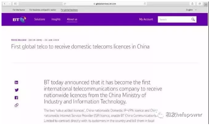 前不久,英國電信官網顯示:英國電信已經拿到第一張中國通信運營的牌照,將成為第一家正式進入中國通信行業的外國企業。。。工信部也正式宣布:英國電信(BT)獲得了在中國全國性經營通信的牌照。。。